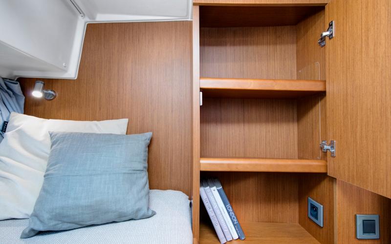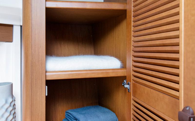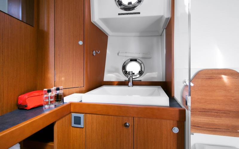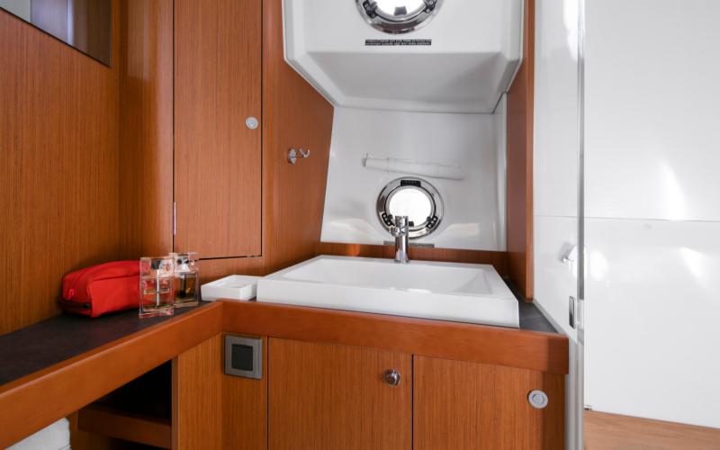 Het interieur is licht en ruim opgezet, met het nieuwe Alpi New Teak krijgt het interieur een meer modern klassieke uitstraling. De dubbele bank is kinderlijk eenvoudig tot dubbel bed om te bouwen en wat opvalt zijn de dubbele openslaande deuren naar de voorhut, een ruimer en lager bed waar u gemakkelijker instapt en de natte cel met gescheiden doucheruimte door een plexiglas deur.