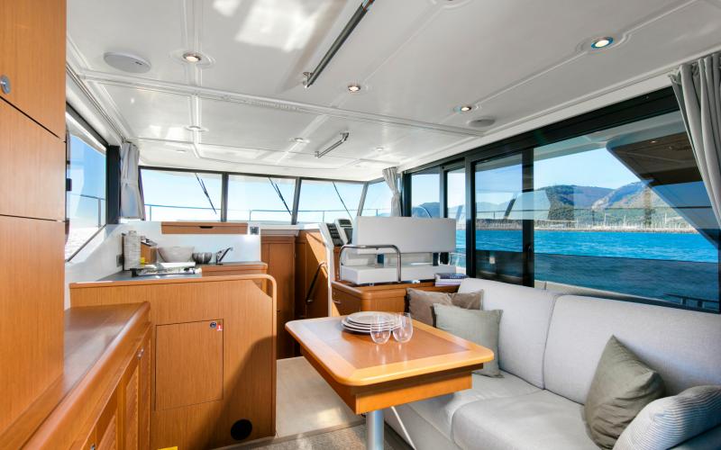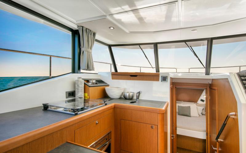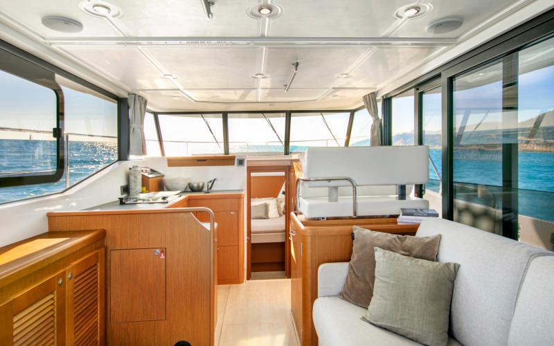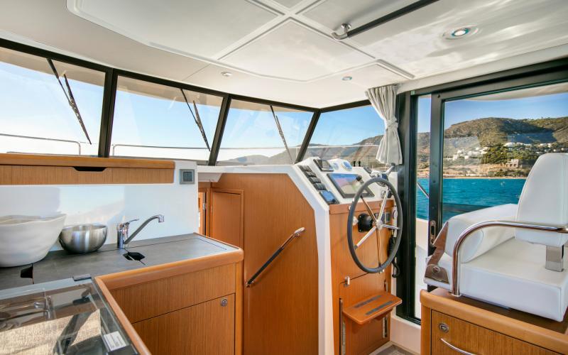 In de salon is de L-kombuis zeer praktisch ingericht voor koken aan boord en onderweg. De schuifdeur bij de stuurstand is breed waardoor u makkelijk naar buiten stapt om de boot vast te leggen bij bruggen en sluizen. Het stuurboord vrijboord voelt zeer veilig door de vaste zeereling en is breder geworden ten opzichte van de vorige Swift Trawler range.