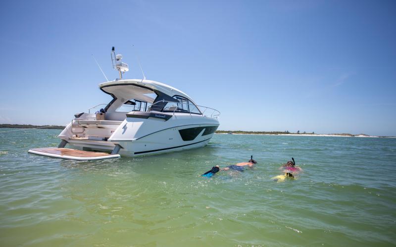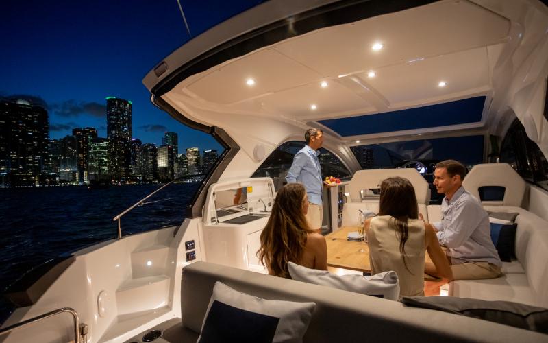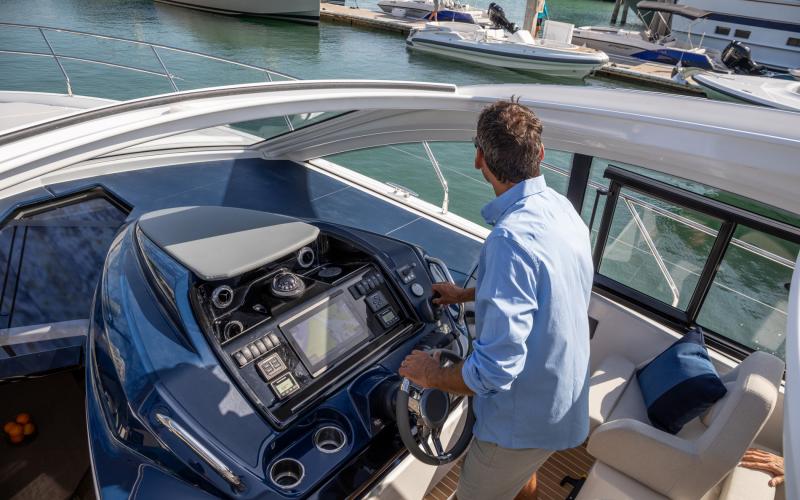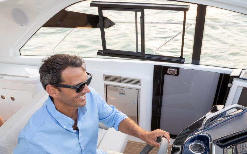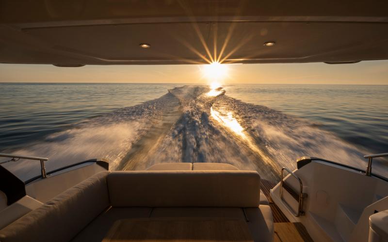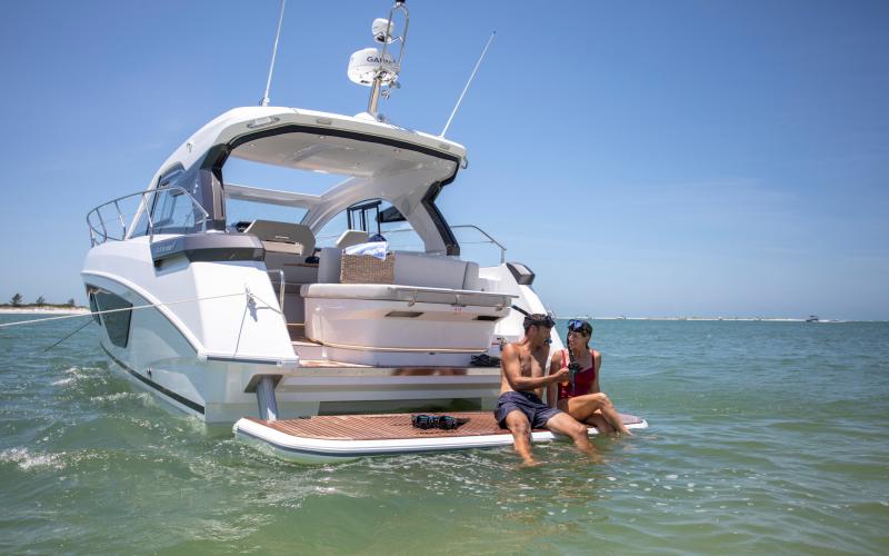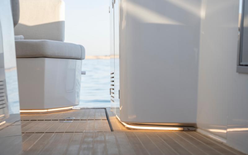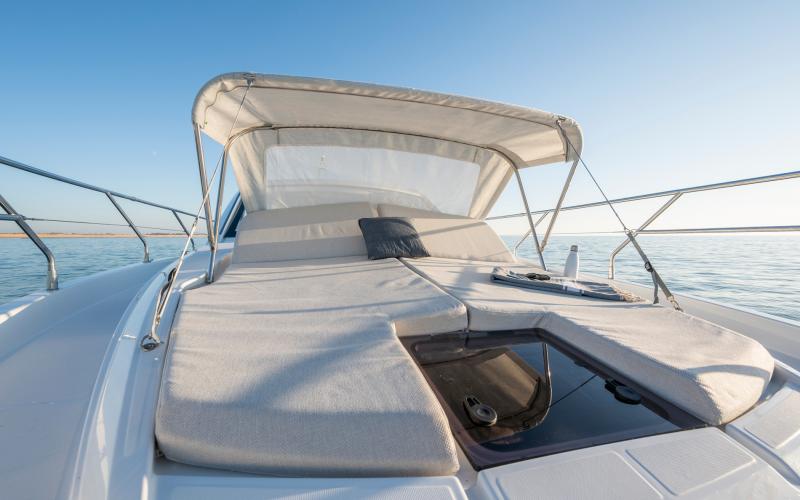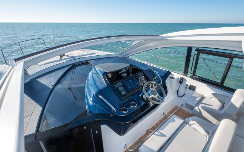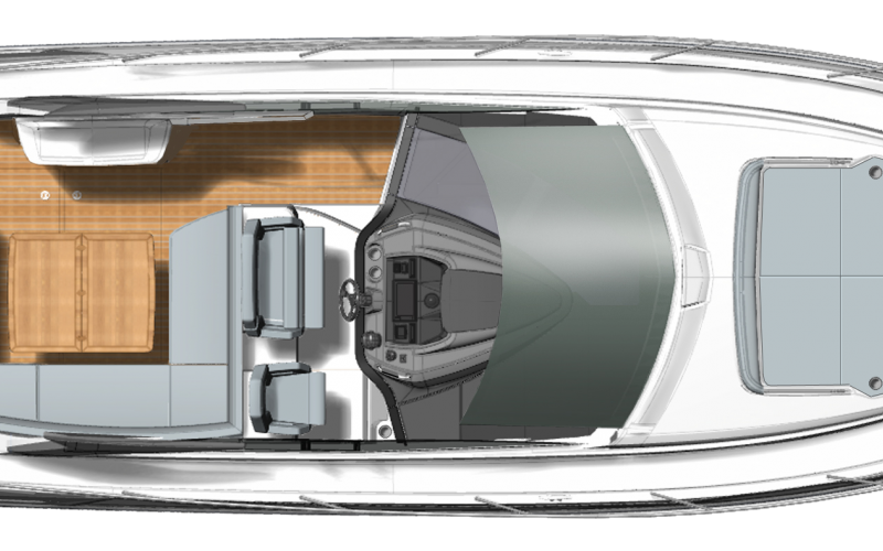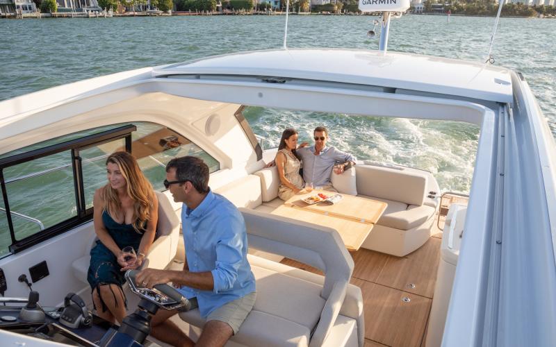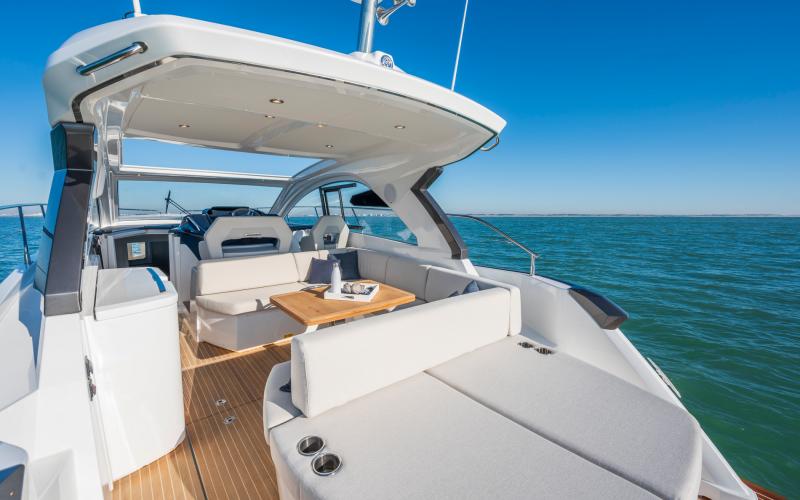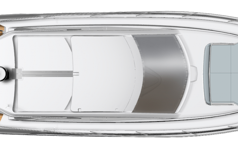De hardtop draagt niet alleen bij aan het sportieve design van de GT41, maar creëert tevens beschutting voor de bemanning en biedt tegelijkertijd een levensstijl die in verbinding staat met de zee. Het grote elektrische zonnedak wordt standaard meegeleverd voor een optimale beleving op het water.