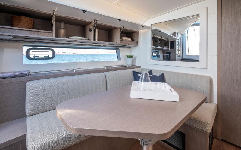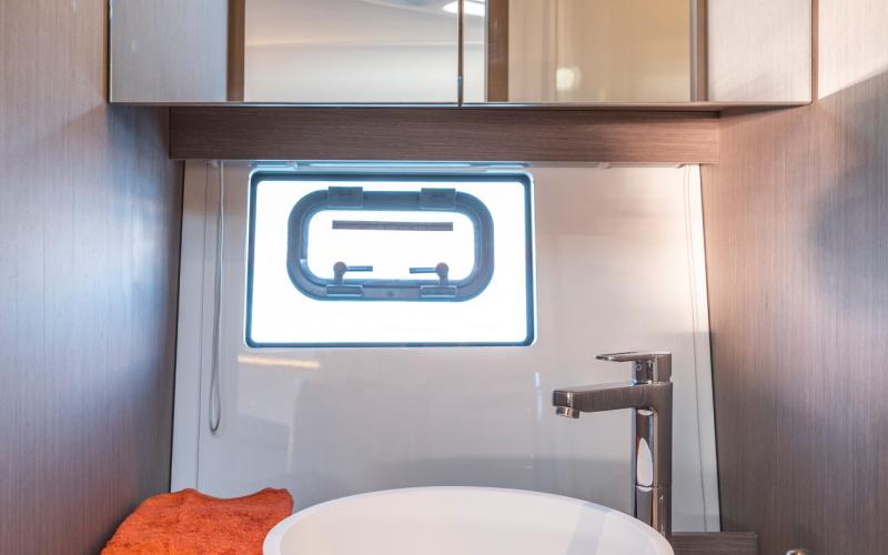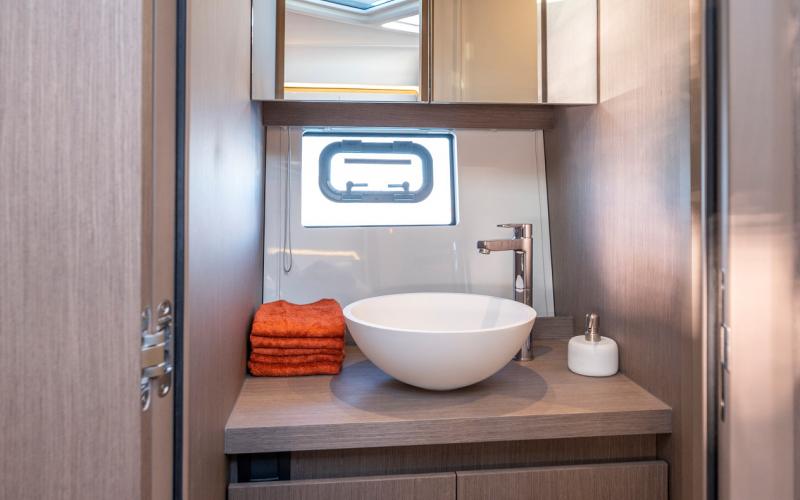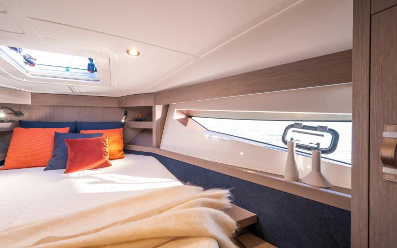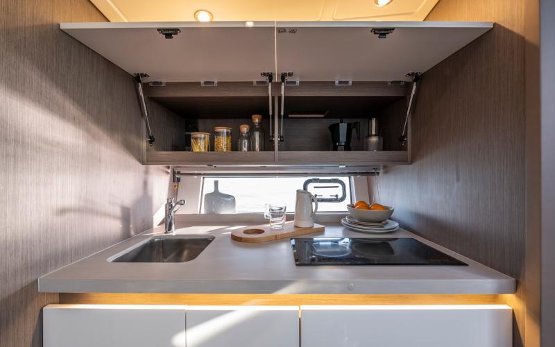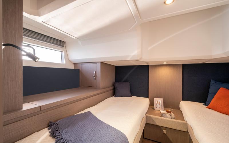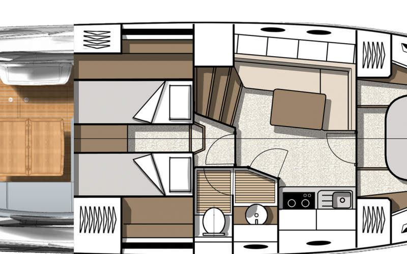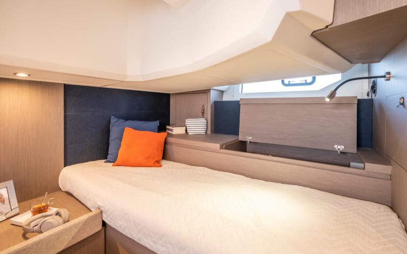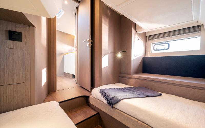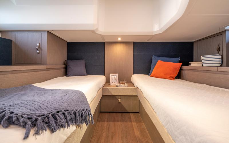 Het benedendek is uiterst geschikt om te cruisen. Naast de kombuis en het toilet zijn er twee afgesloten privé hutten, elk met bedden evenwijdig aan de kiellijn, voor een optimaal verblijf aan boord.