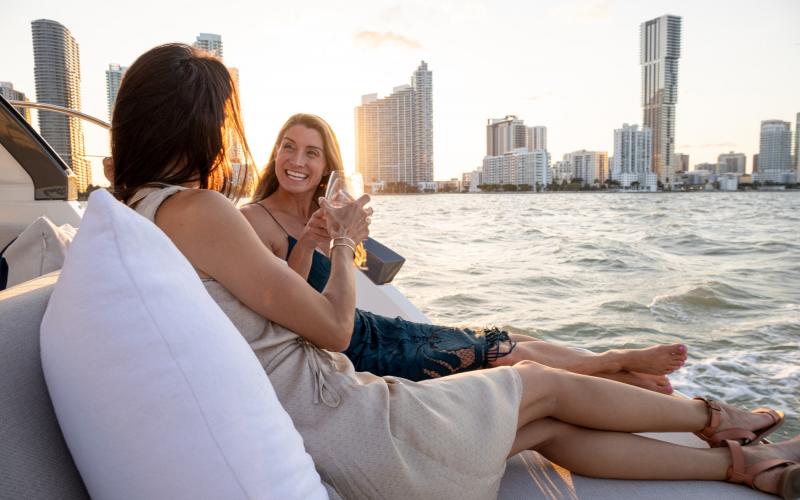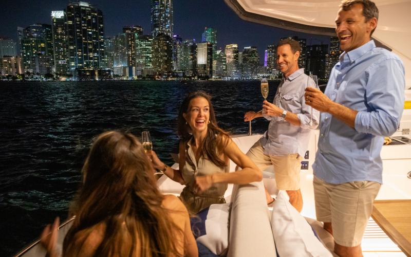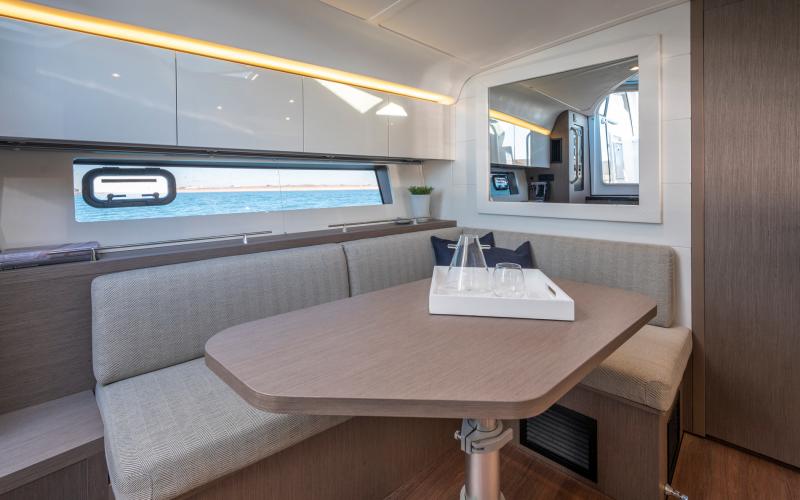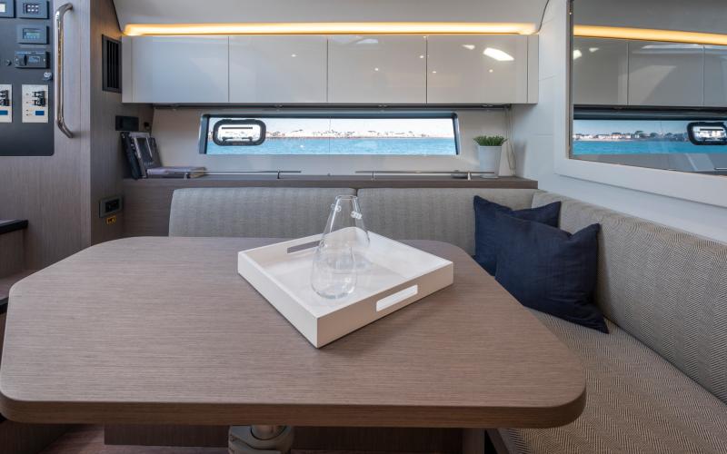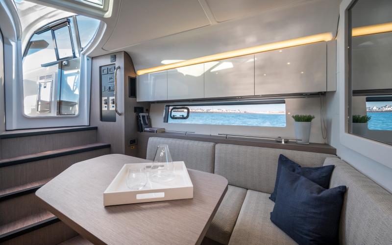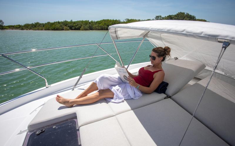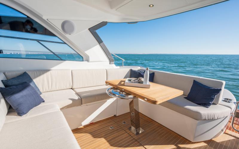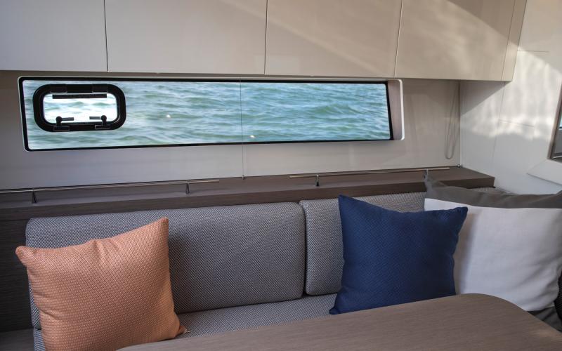Een ander kenmerk van de Gran Turismo 41 is dat ze goed is voor entertainment, zoals te zien is aan de grote salon waar gasten tegenover elkaar zitten, evenals de zonnebedden achterin die op zithoogte zijn geplaatst, waardoor een echte loungeruimte ontstaat met uitzicht op zee.