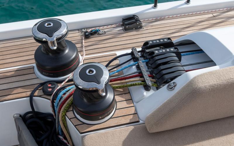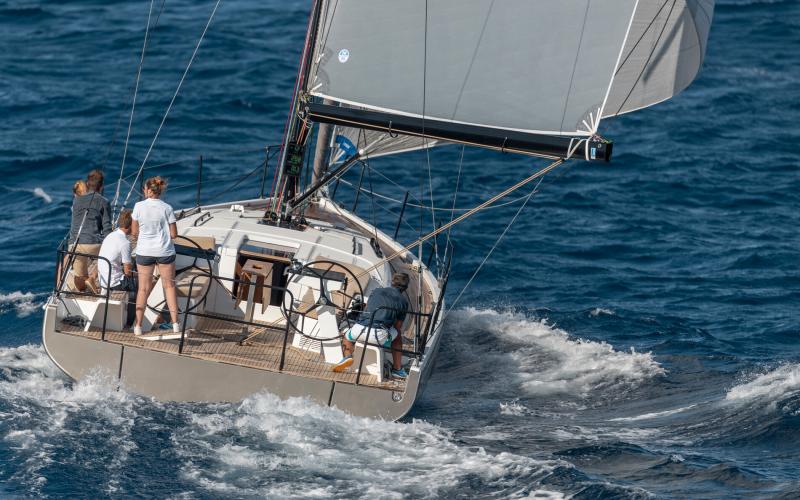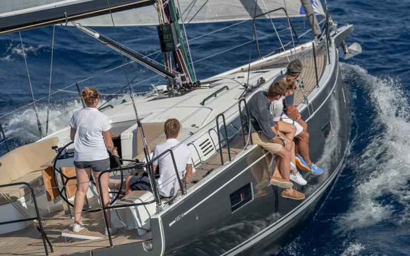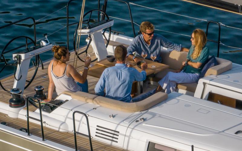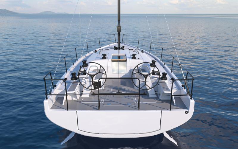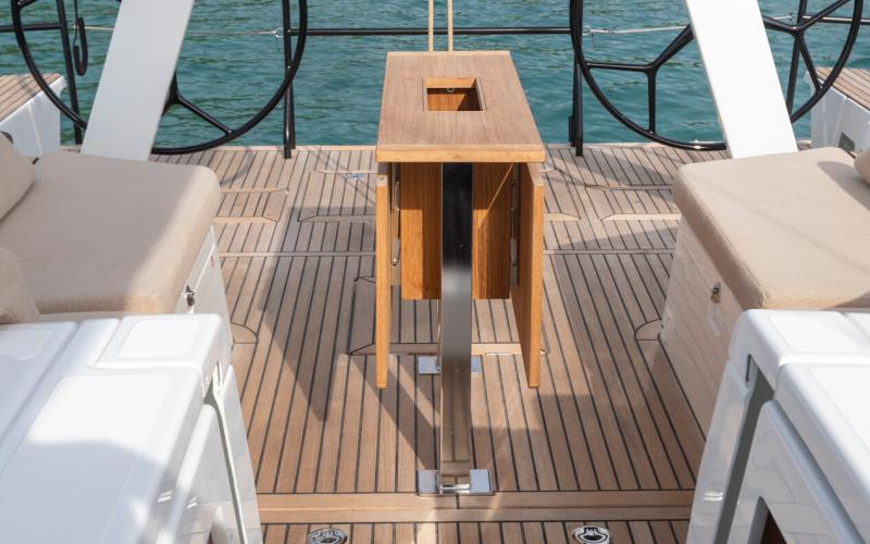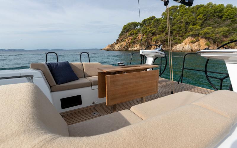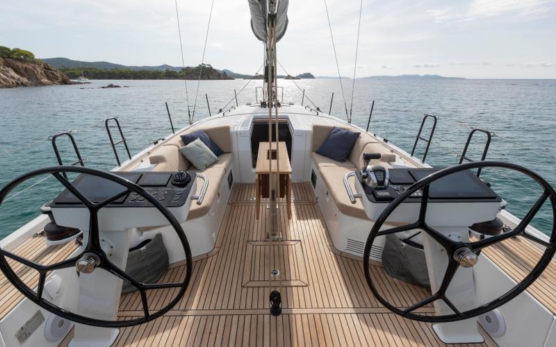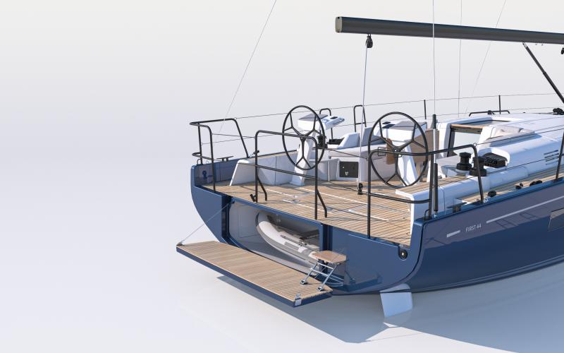 In de FIRST 44 uitvoering is de kuip bijzonder comfortabel met een fraaie kuiptafel en gelijkvloerse toegang tot de brede gangboorden. Vier lieren, een centraal geplaatst grootschootblok en een mast die verder naar achteren is geplaatst maximaliseren het potentieel van het moderne zeilplan, gekenmerkt door een kleiner grootzeil en royaal bemeten voorzeilen.