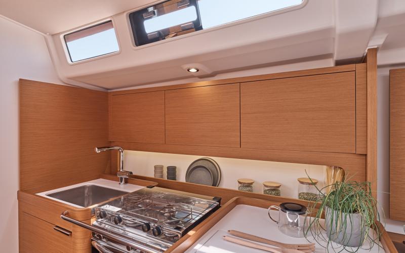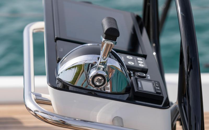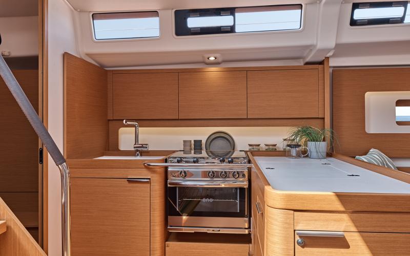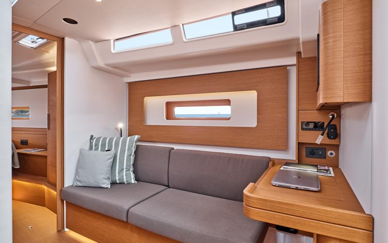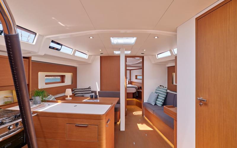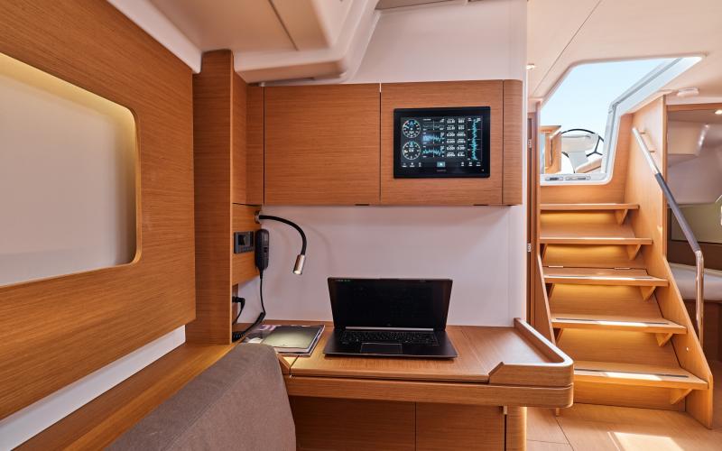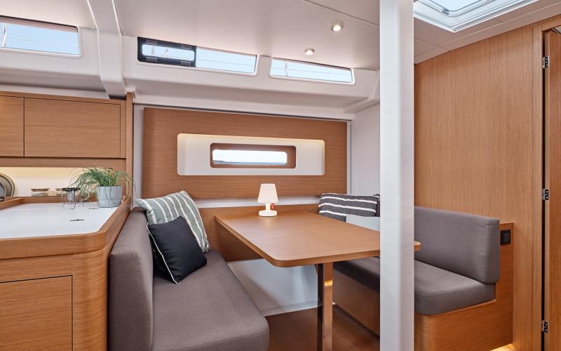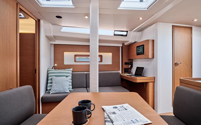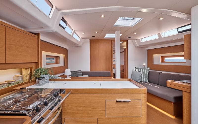 In de salon biedt de multi functionele tafel plaats aan zes personen en kijkt uit op de zitbank en de navigatie zit; de indeling vereenvoudigt de mobiliteit tussen de kombuis en de eigenaarshut en vergroot het ruimtelijk gevoel.