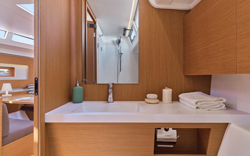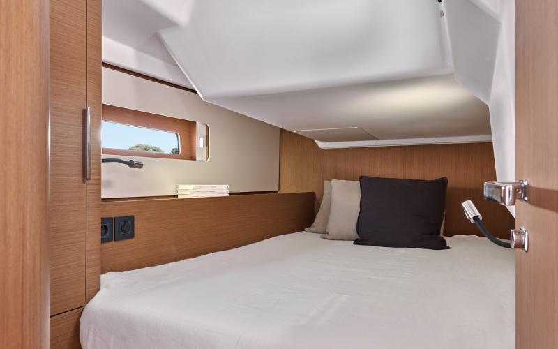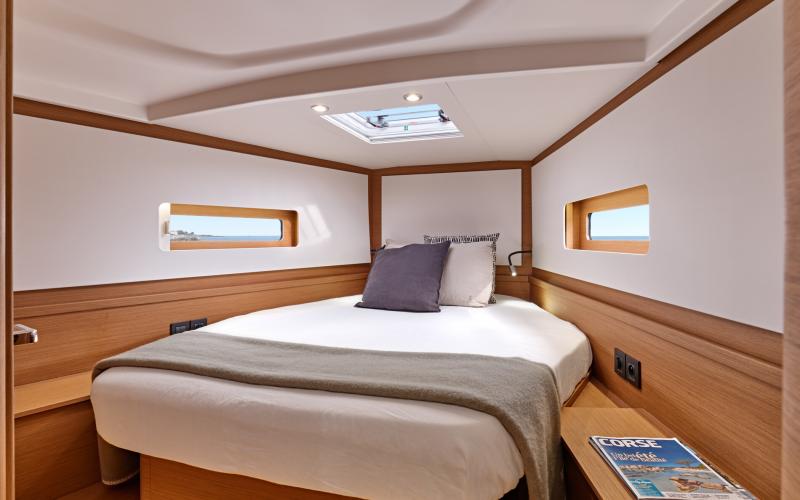 De First 44 wordt geleverd met drie hutten met twee natte cellen. Het interieur is afgewerkt met hoogwaardige materialen om een verfijnde sfeer te creëren.