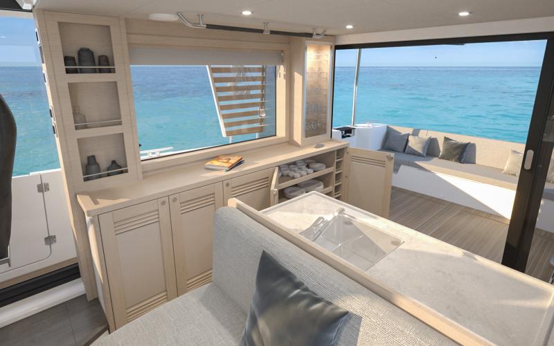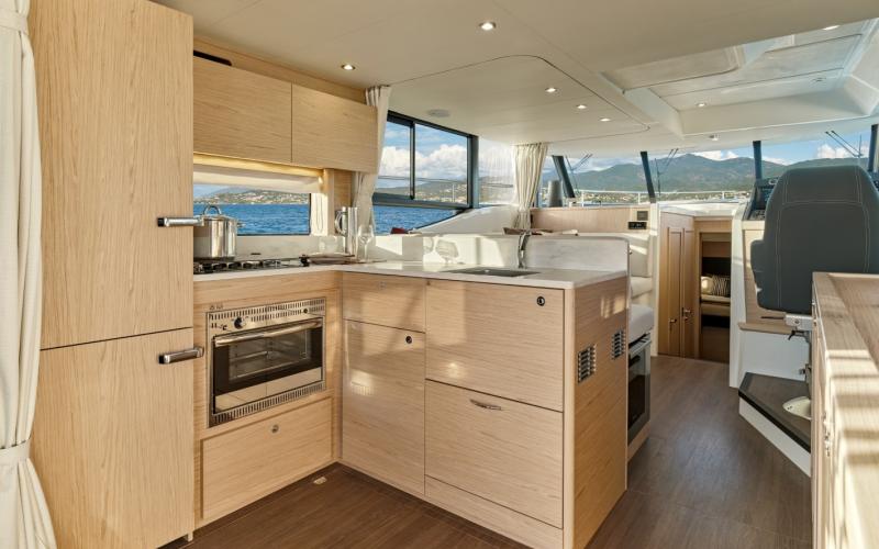 Bij binnenkomst door de openslaande deuren is er een grote L-vormige kombuis aan bakboordzijde met een 255-liter koelkast met vriesvak en riante hoge opbergkasten. De standaard kombuis heeft een gasoven of optionele multifunctionele elektrische oven, een slimme "magische hoek" uittrekbare opbergkast, kasten en laden die voldoende capaciteit garanderen voor langdurig cruisen terwijl er nog steeds ruimte is voor een optionele vaatwasser. Het Corian werkblad heeft een gas- of inductiekookplaat en een grote spoelbak. Tegenover de kombuis is een ruime buffetkast met geïntegreerd flessenrek.