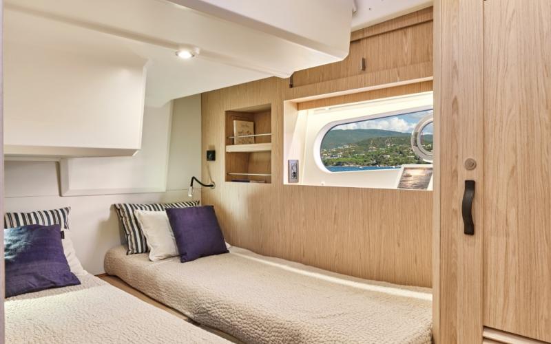 De voorkajuit is voorzien van een tweepersoonsbed dat omhoog kan worden geklapt voor veel bergruimte. Er zijn hoge kasten rijen en lage kasten, grote ramen met ingebouwde patrijspoorten en een luik dat de voorkajuit van veel natuurlijk licht en ventilatie voorziet. De en-suite badkamer heeft een aparte douchecabine met een teakhouten zitje. De gastenhut aan bakboord is voorzien van een groot raam met inzetraam, opbergruimte, kledingkast en twee 1-persoonsbedden met een vulstuk om er een tweepersoonsbed van te maken. Deze hut heeft ook een en-suite deur naar de bakboord natte cel - waar u ook een aparte douchecabine met teak latten zitting vindt. De stuurboord gastenhut heeft twee patrijspoorten, een dwars dubbel bed en een dubbele kast die groot genoeg is om een optionele wasmachine/droger in te plaatsen.