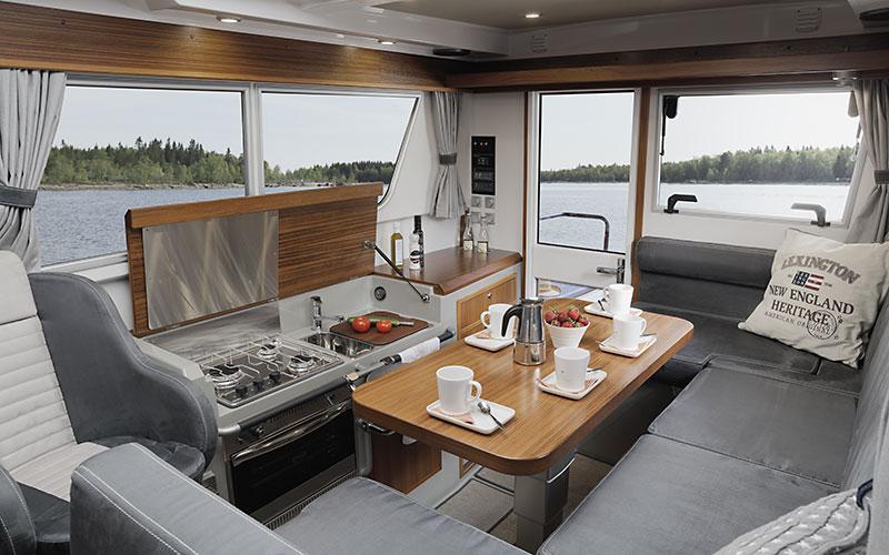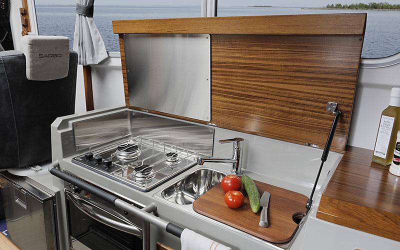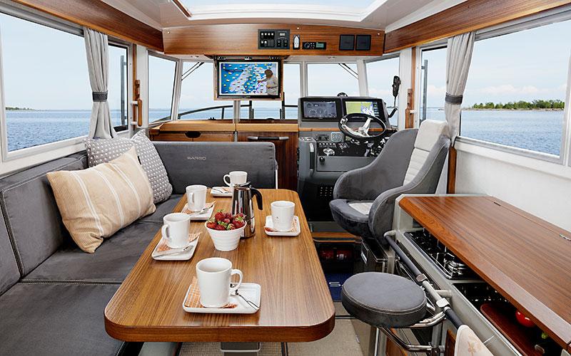 De sportiviteit van de SARGO 33 Explorer komt ook tot uiting in de bijzondere kleurstelling en materiaalkeuze: notenhout en leder. De moderne cockpit - met details in mat zwarte afwerking, verstelbare stuurconsole en een offshore stuurstoel - maakt een ergonomische stuurpositie mogelijk, zowel zittend als staand. Om het vaarplezier te verhogen bieden wij standaard ook PTA (Power Trim Assistant) en automatische trimvlakken aan. De cockpitdeur, die kan worden gecombineerd met een optionele doorgang in het vrijboord, maakt het aan land gaan extra eenvoudig