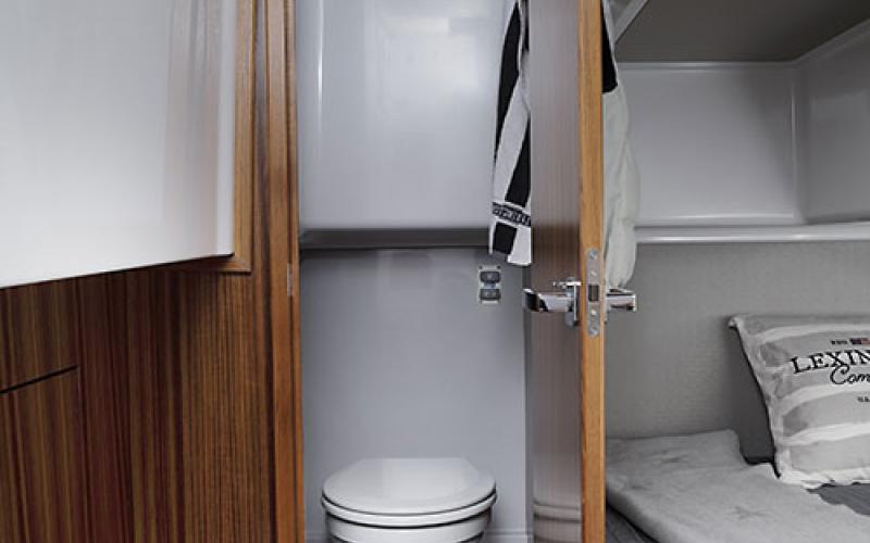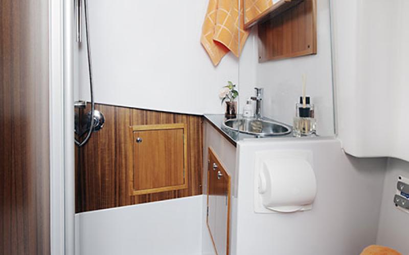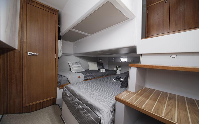 Door gebruik te maken van moderne 3D-planning zijn we erin geslaagd om elke centimeter ruimte te benutten, vooral in de hutten van onze nieuwe SARGO 33. De voorste hut is bovengemiddeld uitgerust als het om een 33 voet boot gaat: grote bergruimte, aangename v-bed, toilet en aparte douchecabine. De midden kajuit biedt drie slaapplaatsen en een divan als standaard of een optionele natte cel.