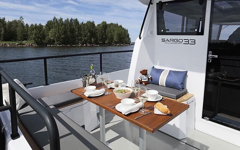De Sargo 33 Explorer is een solide familieboot met een modern karakter. Een lange waterlijn en een sterke V versterkt het vleugje sportiviteit en zorgt voor een veilige vaarbeleving. Het rondlopende gelijkvloerse dek met een hoog vrijboord is voorzien van zwart gepoedercoate rvs rails. Het grote achterdek kan worden gebruikt voor transport of als eetruimte. Er is ook plaats voor een geïntegreerde koelbox achter de stuurhut.
