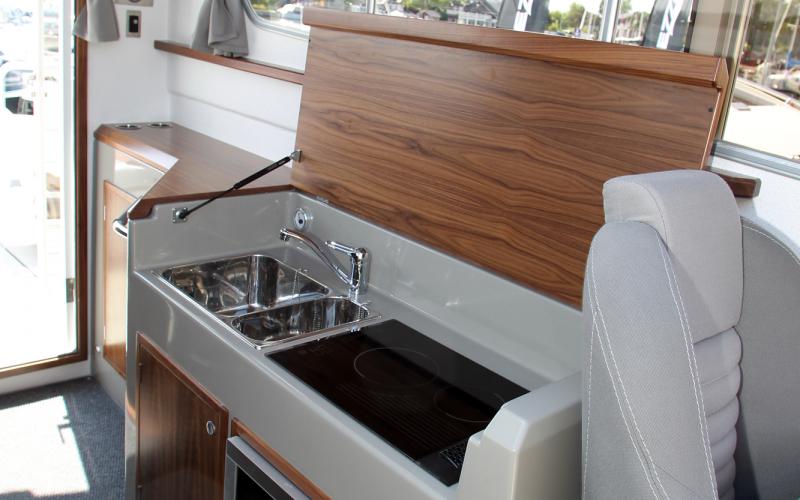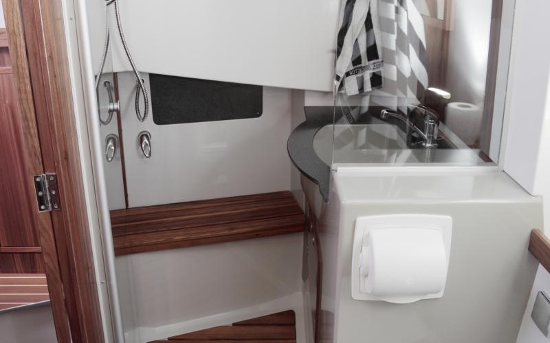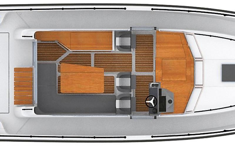 Een ander typisch en onderscheidend Sargo kenmerk is het schuifdak in het stuurhuis, wat voorziet in die heerlijk frisse zeelucht en veel zonneschijn. Ook de midscheepse afstap middels een doorgang in het vrijboord is een uniek Sargo kenmerk.