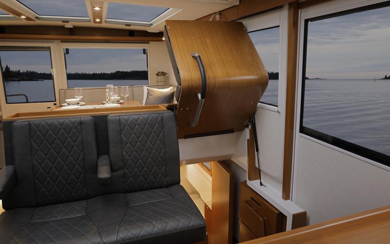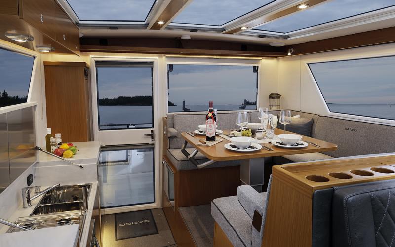 De SARGO 45 heeft 2 ruimtes op het dek op sociale interactie ingericht, een U-sofa op de boeg en een ruime L-sofa achterin. Het dek rondom de boot is geheel gelijkvloers en de 2 brede zijdeuren en de achterdeur maken de toegang tot het stuurhuis zeer eenvoudig.