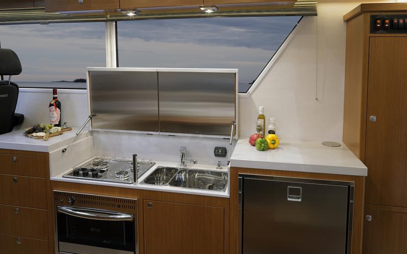 In het stuurhuis is er bij uitzondering plaats voor 4 personen in de voorbank, een grote 8-persoons eethoek en een praktisch ingerichte kombuis. De stuurstand is de bekende SARGO opstelling met de functionele kantelbare stuurconsole.