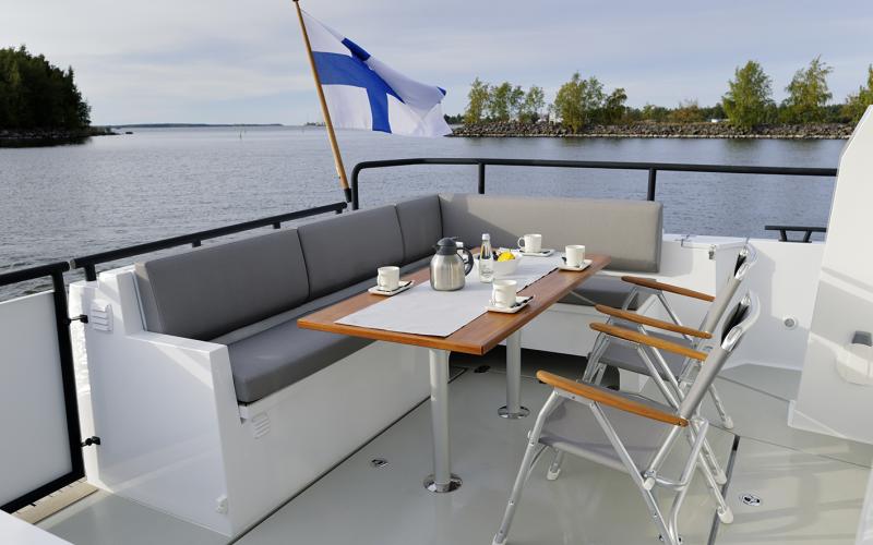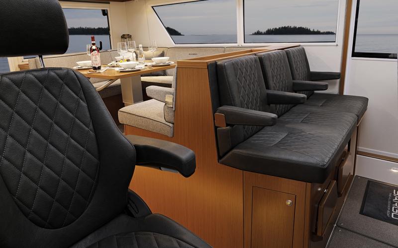 De SARGO 45 heeft 2 ruimtes op het dek op sociale interactie ingericht, een U-sofa op de boeg en een ruime L-sofa achterin. Het dek rondom de boot is geheel gelijkvloers en de 2 brede zijdeuren en de achterdeur maken de toegang tot het stuurhuis zeer eenvoudig.